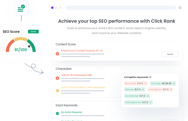 Clickrank let you optimize titles, meta descriptions, alt texts, and schema markups with 1 click.